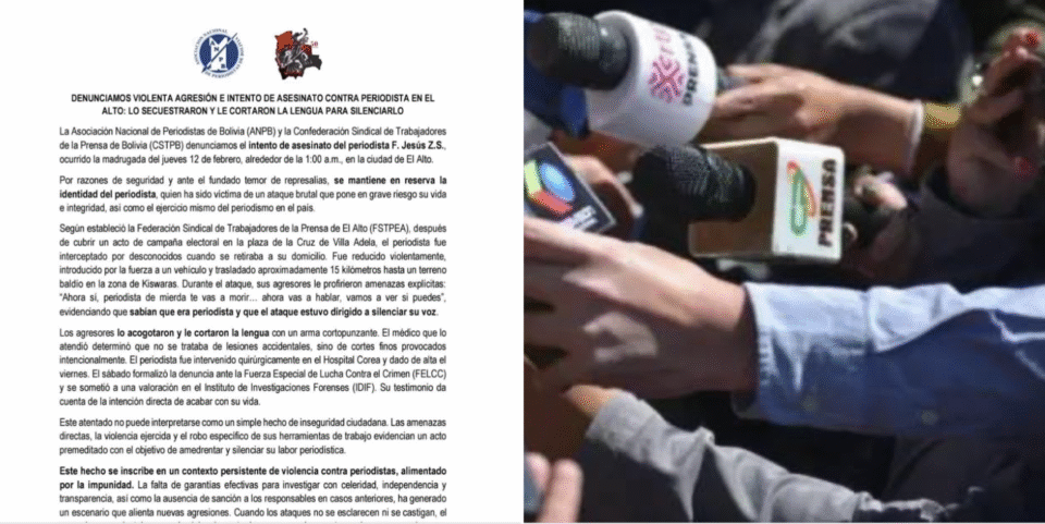 Bolivia, 15 feb 2026 (RED DTV).– La Asociación Nacional de Periodistas de Bolivia (ANPB) y la Confederación Sindical de Trabajadores de la Prensa de Bolivia (CSTPB) denuncian el intento de asesinato del periodista F. Jesús Z.S., ocurrido la madrugada del jueves 12 de febrero, alrededor de la 1:00 a.m., en la ciudad de El Alto.