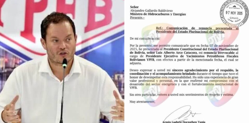 La Paz, 07 de nov de 2025 (RED DTV).– El presidente ejecutivo de Yacimientos Petrolíferos Fiscales Bolivianos (YPFB), Armin Ludwig Dorgathen Tapia, presentó este viernes su renuncia irrevocable al cargo ante el presidente del Estado, Luis Arce, con efectos a partir de la misma fecha.
