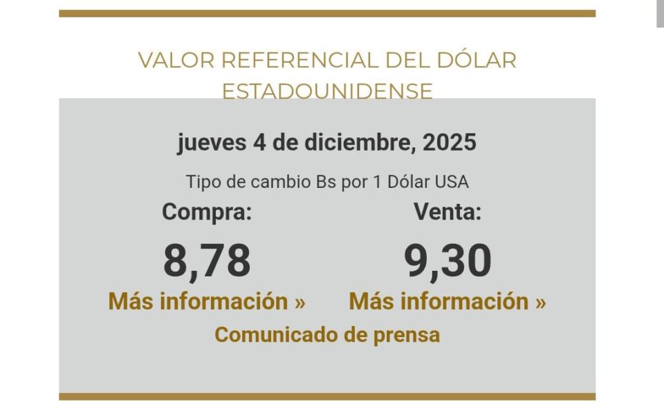 ECONOMÍABCB actualiza el valor referencial del dólar: compra sube a Bs 8,78 y venta a Bs 9,30 4 de diciembre de 20254 de diciembre de 2025027 Bolivia, 4 dic 2025 (red DTV).- El Banco Central de Bolivia publicó este jueves 4 de diciembre de 2025 el nuevo valor referencial del dólar estadounidense, fijando la cotización en Bs 8,78 para la compra y Bs 9,30 para la venta.