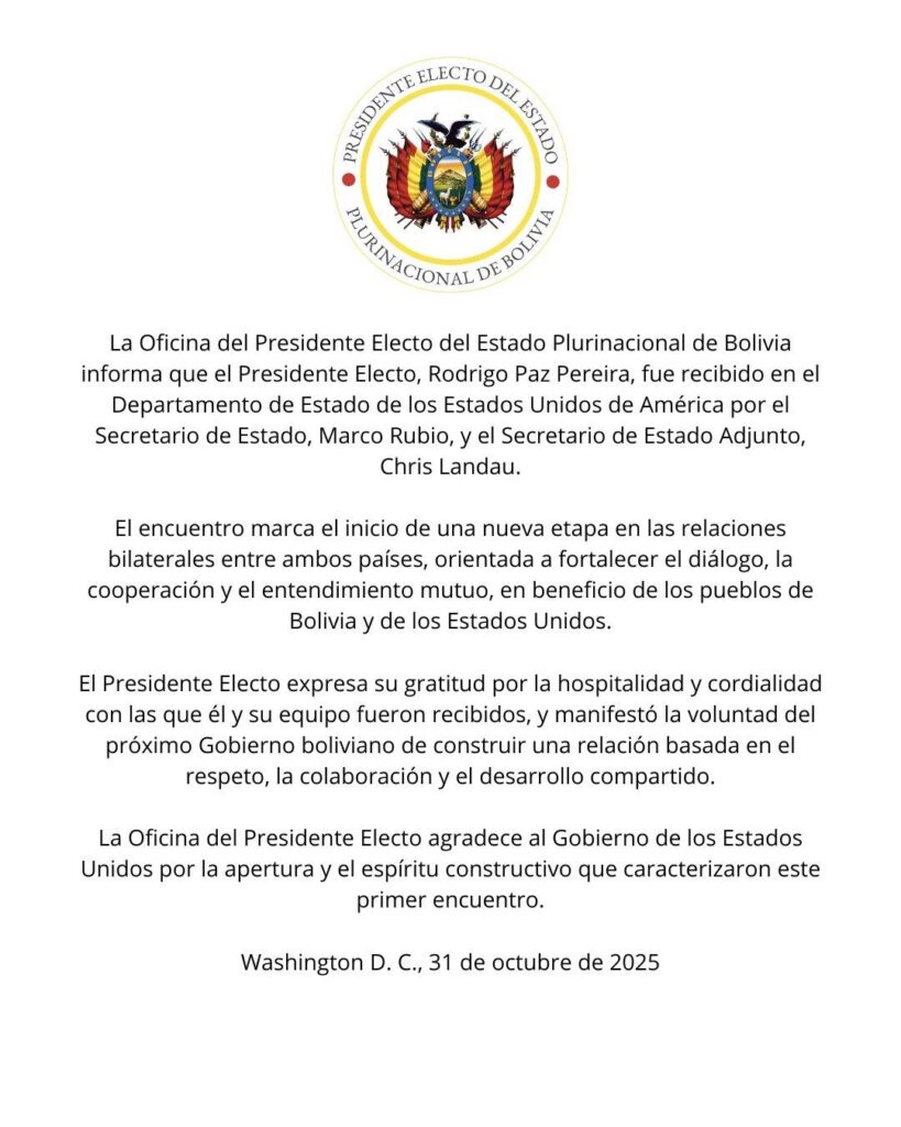 De acuerdo con el comunicado oficial, el encuentro marca el inicio de una nueva etapa en las relaciones bilaterales entre ambos países, orientada a fortalecer el diálogo, la cooperación y el entendimiento mutuo, en beneficio de los pueblos de Bolivia y de los Estados Unidos.