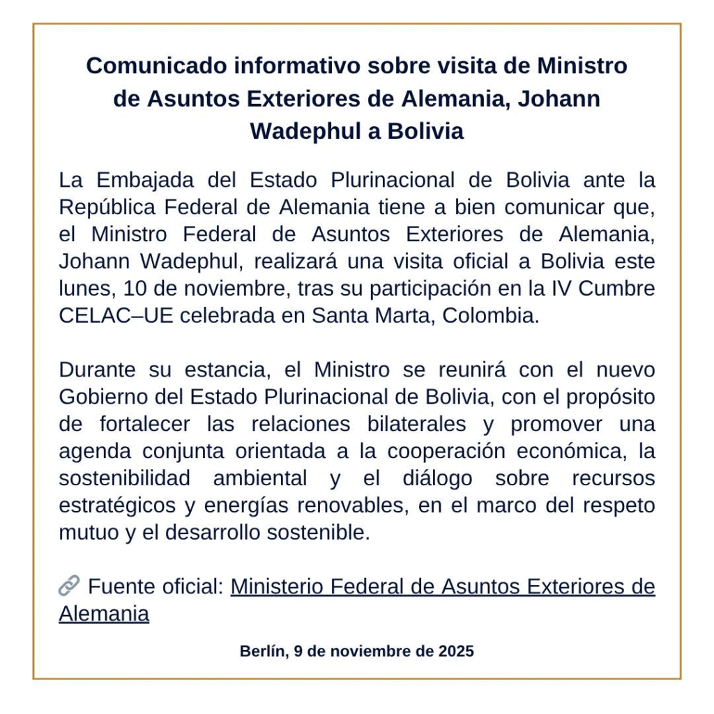 La Paz, 10 de nov 2025 (RED DTV).-En la madrugada de este lunes arribó a Bolivia el ministro de Asuntos Exteriores de Alemania, Johan David Wadephul, con el propósito de reunirse con las nuevas autoridades nacionales y fortalecer la relación bilateral.