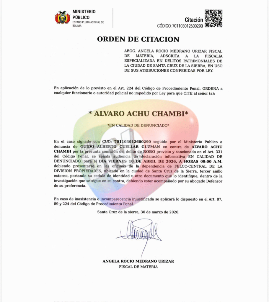 La citación, firmada por la fiscal de materia Ángela Rocío Medrano Urizar, establece que el oficial deberá presentarse a declarar el viernes 10 de abril de 2026 en dependencias de la Fuerza Especial de Lucha Contra el Crimen (FELCC), dentro de un proceso iniciado tras la denuncia presentada por Guido Alberto Cuéllar Guzmán.