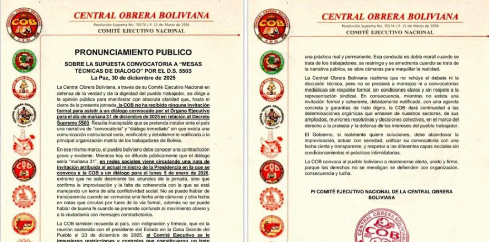 Bolivia, 31 dic de 2025 (RED DTV).- La Central Obrera Boliviana (COB), a través de su Comité Ejecutivo Nacional, afirmó que hasta el cierre de la jornada no ha recibido ninguna invitación formal para asistir a un diálogo convocado por el Órgano Ejecutivo sobre el Decreto Supremo 5503.