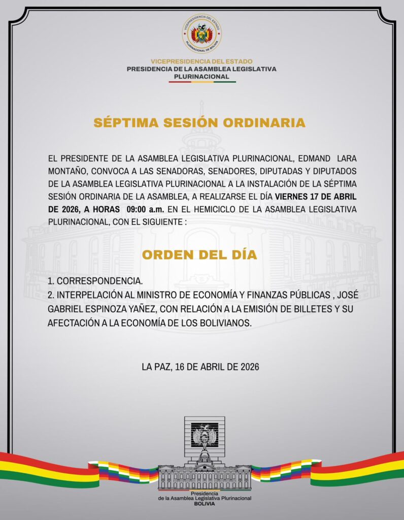 LPZ, 16 abr 2026 (RED DTV).- El presidente nato de la Asamblea Legislativa Plurinacional, Edmand Lara, convocó a su séptima sesión ordinaria para este viernes 17 de abril a las 09:00 en el hemiciclo legislativo donde el punto central será la interpelación al ministro de Economía y Finanzas Públicas, José Gabriel Espinoza Yáñez, por la emisión de billetes y su posible afectación a la economía de los bolivianos.