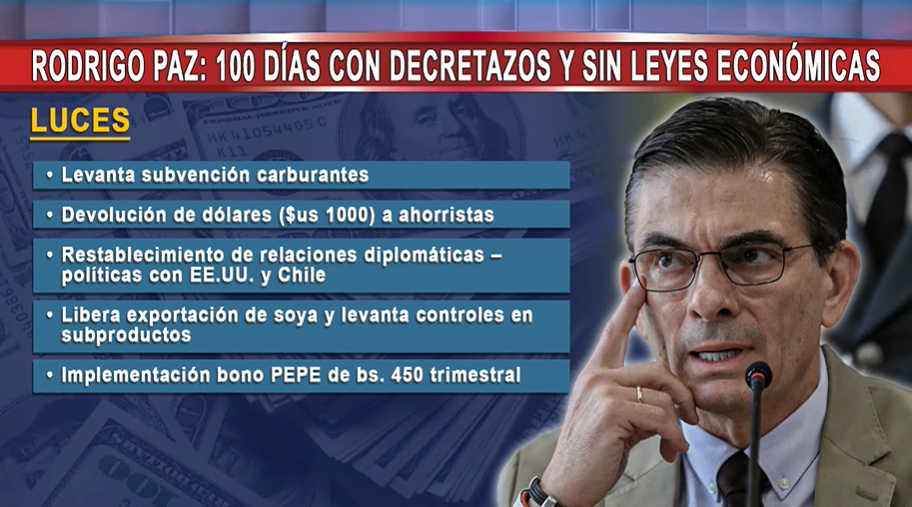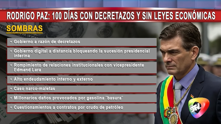Bolivia, 18 feb 2026 (RED DTV).- Se cumplen los primeros cien días del gobierno de Rodrigo Paz, una gestión marcada por decisiones económicas vía decreto y una agenda que combina anuncios de impacto con una creciente lista de cuestionamientos políticos y financieros.