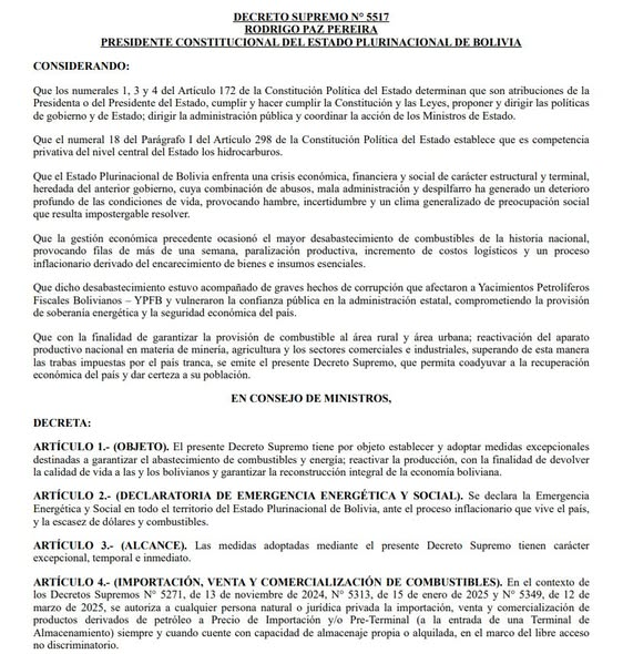 Tarija, 14 ene 2026 (RED DTV).- El Ejecutivo nacional declaró Emergencia Energética y Social en todo el territorio boliviano mediante el Decreto Supremo N.º 5517, aprobado por el presidente Rodrigo Paz Pereira junto a su gabinete ministerial. La medida surge como respuesta al aumento de la inflación y a la escasez de divisas y combustibles que afecta al país.