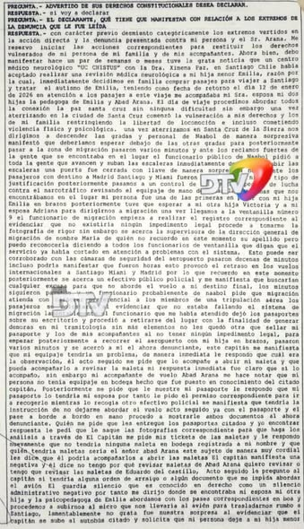 Finalmente, Del Castillo reiteró que las versiones presentadas por el denunciante son falsas y aseguró que durante el proceso no fue objeto de presión para declarar. Añadió que se vulneraron los derechos de su familia y de otros pasajeros cuyos vuelos fueron retrasados, y expresó su expectativa de que este tipo de hechos no vuelva a repetirse, en resguardo de la imagen del país.