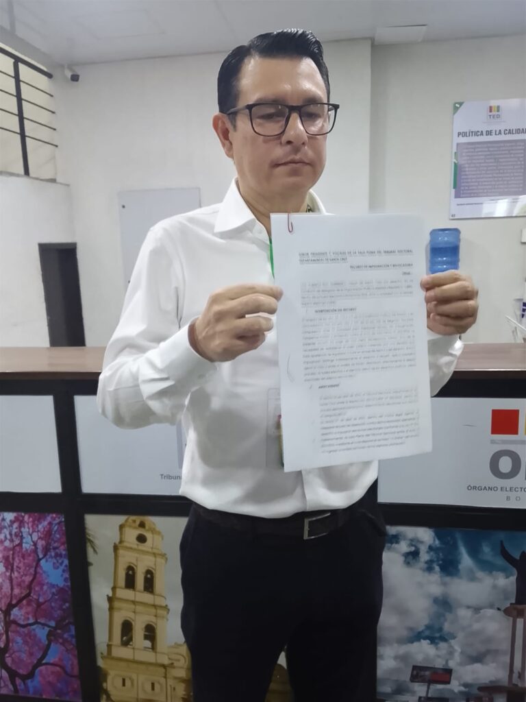 Santa Cruz, 09 de abril de 2026 (RED DTV) .- El delegado de Libre, Luis Ruiz, presentó un segundo recurso de impugnación y revocatoria ante el Tribunal Departamental Electoral (TED), en el marco de las observaciones al proceso electoral en la provincia de Chiquitos, donde denuncian presuntas irregularidades.