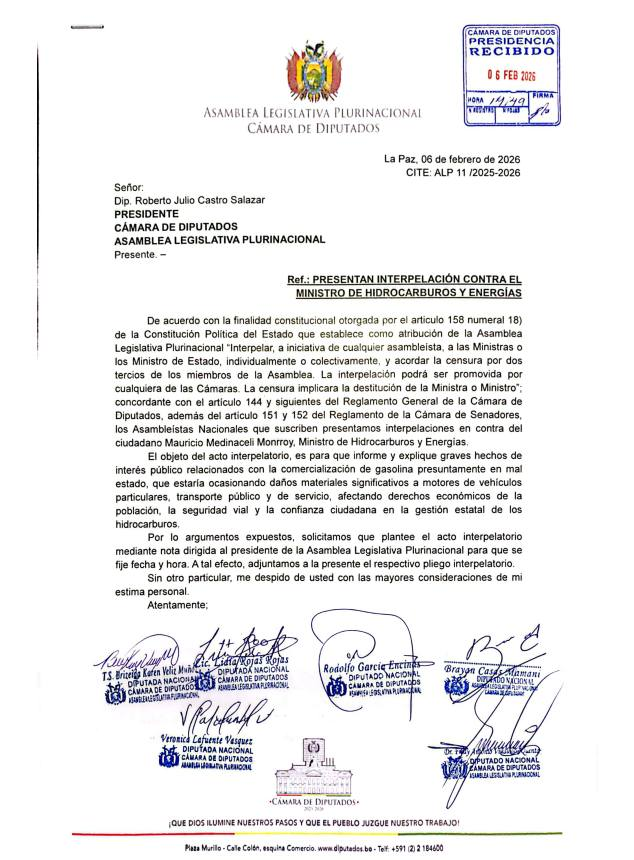Bolivia, 6 feb 2026 (RED DTV).- La Cámara de Diputados de la Asamblea Legislativa Plurinacional recibió este viernes 6 de febrero de 2026 la interpelación contra el ministro de Hidrocarburos y Energías, Mauricio Medinaceli Monrroy, promovida por un grupo de legisladores nacionales. El acto interpelatorio busca que el ministro informe sobre graves hechos de interés público relacionados con la comercialización de gasolina presuntamente en mal estado, que habría causado daños significativos a motores de vehículos particulares, transporte público y de servicio, afectando los derechos económicos de la población, la seguridad vial y la confianza ciudadana en la gestión estatal de los hidrocarburos.