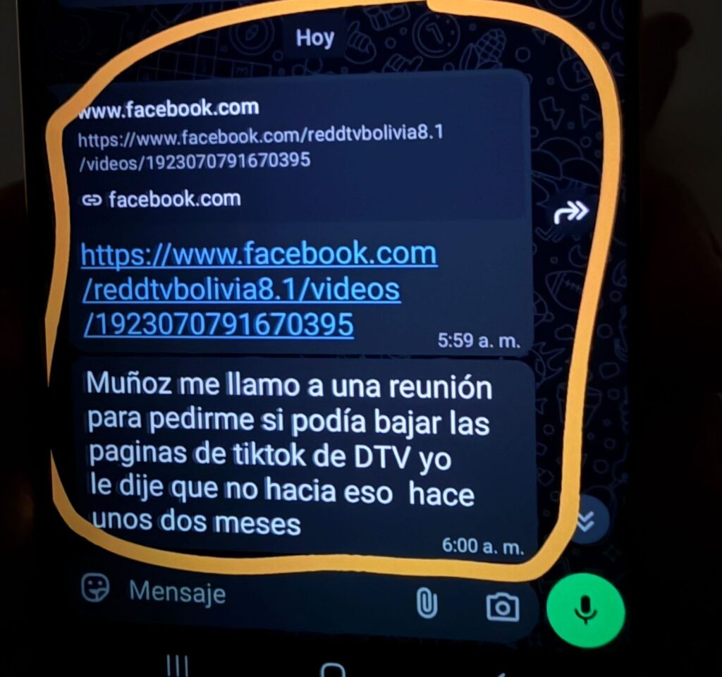 De acuerdo con mensajes a los cuales accedió la RED DTV, Muñoz contactó a un experto en redes sociales para solicitar la caída de cuentas de DTV. En una mensaje señala: “Muñoz me llamó a una reunión para pedirme si podía bajar las páginas de TikTok de DTV; yo le dije que no hacía eso, hace unos dos meses”.