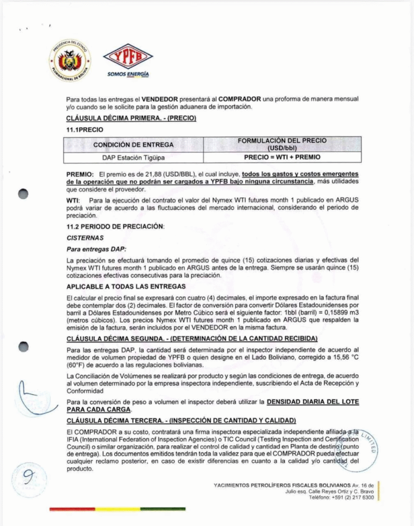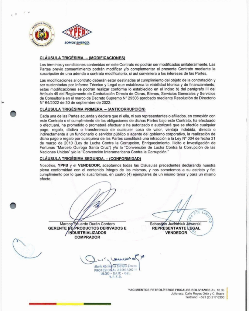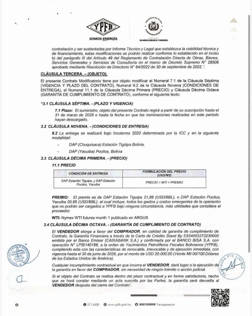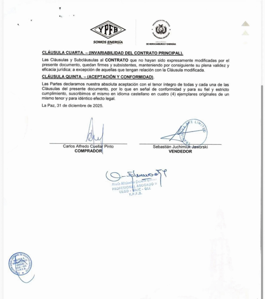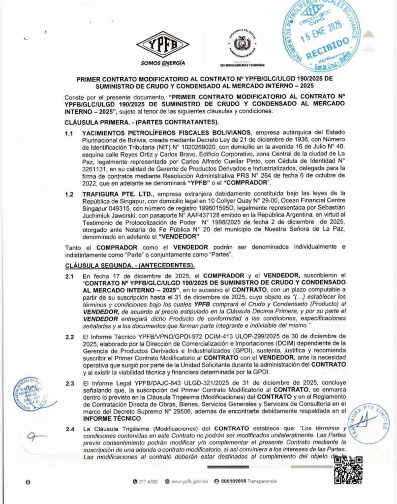 No obstante ello, están circulando en las redes 2 documentos: Un supuesto contrato N° YPFB/GLS/ULGD 190/2025 de Suministro de Crudo y Condensado al mercado interno, de fecha 17 de diciembre de 2025 y una adenda a este contrato de fecha 31 de diciembre de 2025, ambos suscritos en este Gobierno por YPFB con TRAFIGURA PTE.LTD.