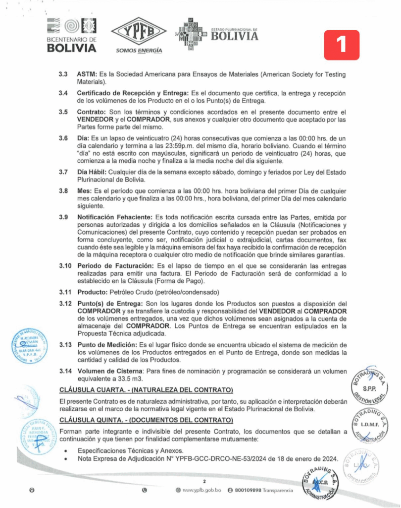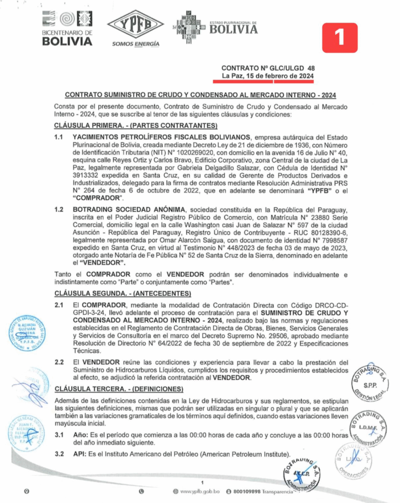 En el contrato identificado como GLC/ULGD N.º 48, firmado con Botrading S.A., YPFB estableció la provisión de crudo y condensado bajo condiciones DAP (Delivered At Place) en distintos puntos de entrega. Los documentos consignan volúmenes referenciales de hasta 150.000 barriles en la estación Pocitos (Yacuiba), 600.000 barriles en la estación Tiguipa (Chuquisaca) y 200.000 barriles en la terminal Sica Sica – Arica, con un monto máximo contractual de 89,69 millones de dólares. En este contrato, el premio por barril fue fijado en 9,10 dólares para Pocitos y 18,41 dólares para la terminal de Arica.