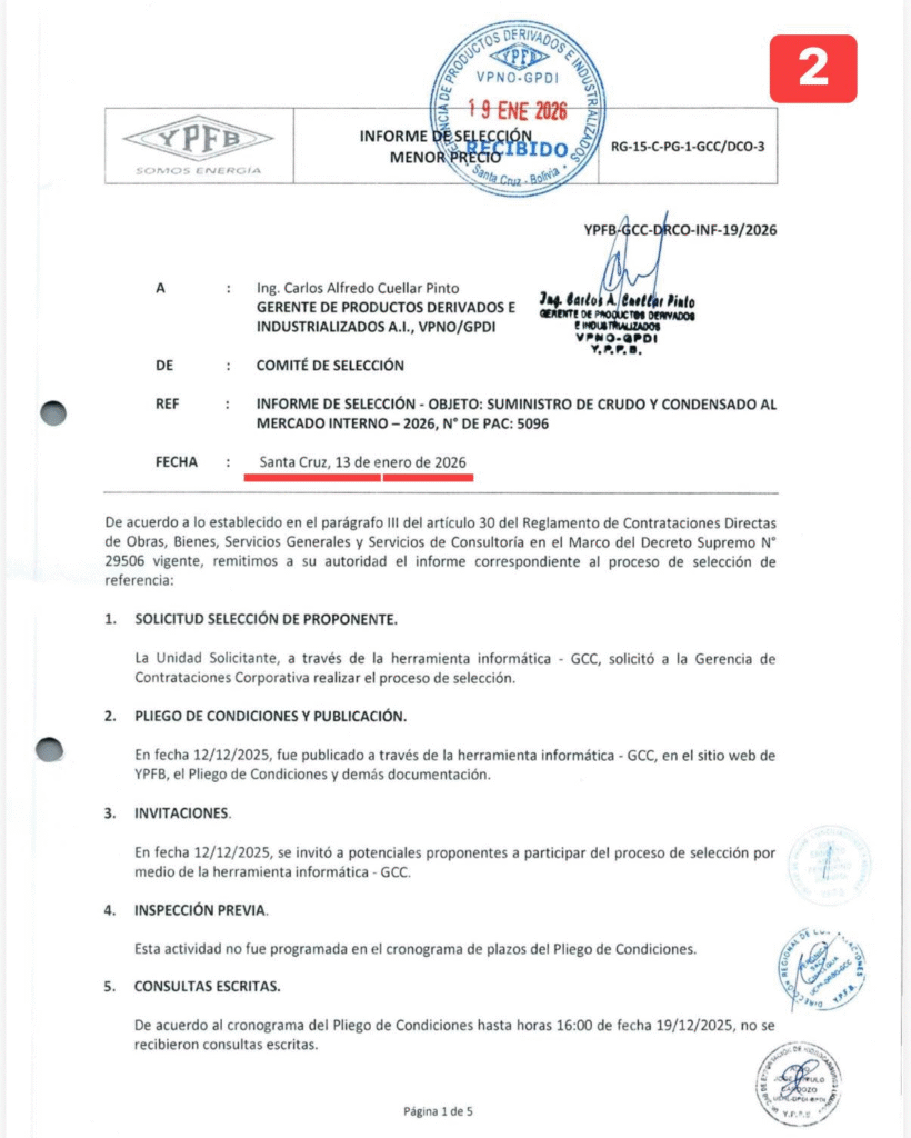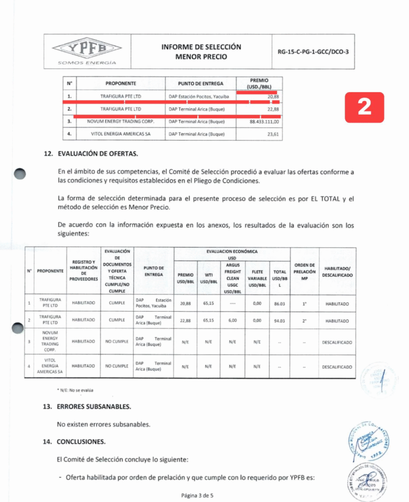 Por su parte, los documentos del Informe de Selección – Menor Precio del proceso correspondiente a la gestión 2026 indican que YPFB adjudicó el suministro de crudo y condensado a Trafigura Pte Ltd. En este caso, los premios establecidos fueron de 20,88 dólares por barril para la estación Pocitos (Yacuiba) y de 22,88 dólares por barril para la terminal de Arica (Buque), según consta en las actas oficiales.
