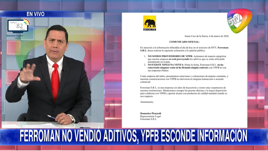 LPZ, 9 marzo 2026 (RED DTV).- Se reporta que la nueva gasolina que está siendo aditivada está generando preocupación. La RED DTV se comunicó con FERROMAN este pasado sábado y dijeron: “Nosotros cotizamos, pero NO LES VENDIMOS A YPFB porque teníamos serias observaciones respecto a cómo se pretendía llevar adelante la mezcla del aditivo con la gasolina”.