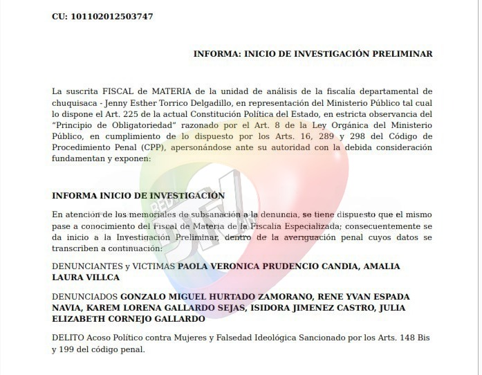 La fiscal Jhenny Esther Torrico Delgadillo señaló que, tras la subsanación de los memoriales de observación, se dio curso a la investigación preliminar, que estará a cargo de la Policía Nacional.