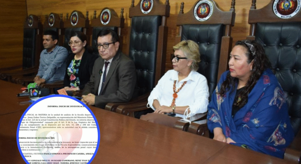 Los denunciados son Gonzalo Miguel Hurtado Zambrano, René Iván Espada Navia, Karem Lorena Gallardo Sejas, Isidora Jiménez Castro y Julio Elizabeth Cornejo Gallardo. La fiscalía busca esclarecer “la verdad histórica y material de los hechos denunciados”, según el documento.