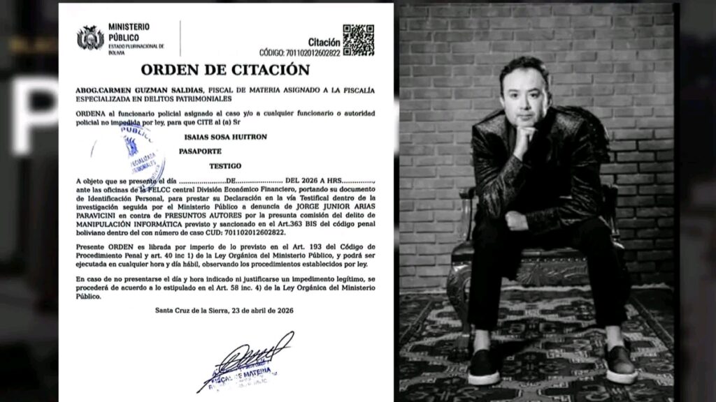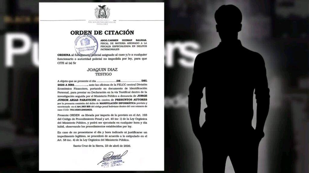 Las citaciones, emitidas el 23 de abril de 2026 en Santa Cruz de la Sierra, forman parte de la investigación abierta por el delito de manipulación informática, tipificado en el artículo 363 Bis del Código Penal boliviano. Según los documentos, los convocados deberán prestar su declaración dentro del proceso seguido contra “presuntos autores”.
