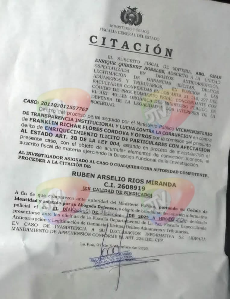 La Paz, 26 nov de 2025 (RED DTV).–El fiscal de Transparencia, Omar Quisbert, informó que el Ministerio Público investiga a cinco personas, entre ellas el exgerente de EMAPA, Franklin Richard Flores, y el dirigente panificador Rubén Ríos, por presuntos hechos de corrupción en convenios de subvención de harina, que habrían ocasionado un daño económico de Bs 6,2 millones.