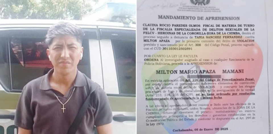 Bolivia, 15 ene 2026 (RED DTV).- La Fiscalía Departamental de Cochabamba emitió un mandamiento de aprehensión contra el tiktoker boliviano Milton Mario Apaza Mamani, investigado por la presunta comisión del delito de violación, tipificado en el artículo 308 del Código Penal, según consta en un documento oficial que comenzó a circular en redes sociales.