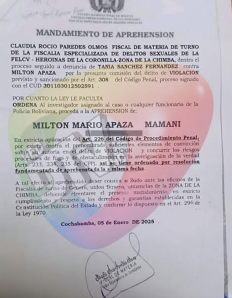 De acuerdo con el mandamiento, la orden fue firmada por la fiscal de materia Claudia Rocío Paredes Olmos, de la Fiscalía Especializada en Delitos Sexuales de la FELCV Heroínas de la Coronilla – zona de la Chimba, dentro de un proceso iniciado por denuncia de Tania Sánchez Fernández. El documento establece que existen suficientes elementos de convicción sobre la presunta autoría del investigado, además de riesgos procesales de fuga y obstaculización de la investigación.