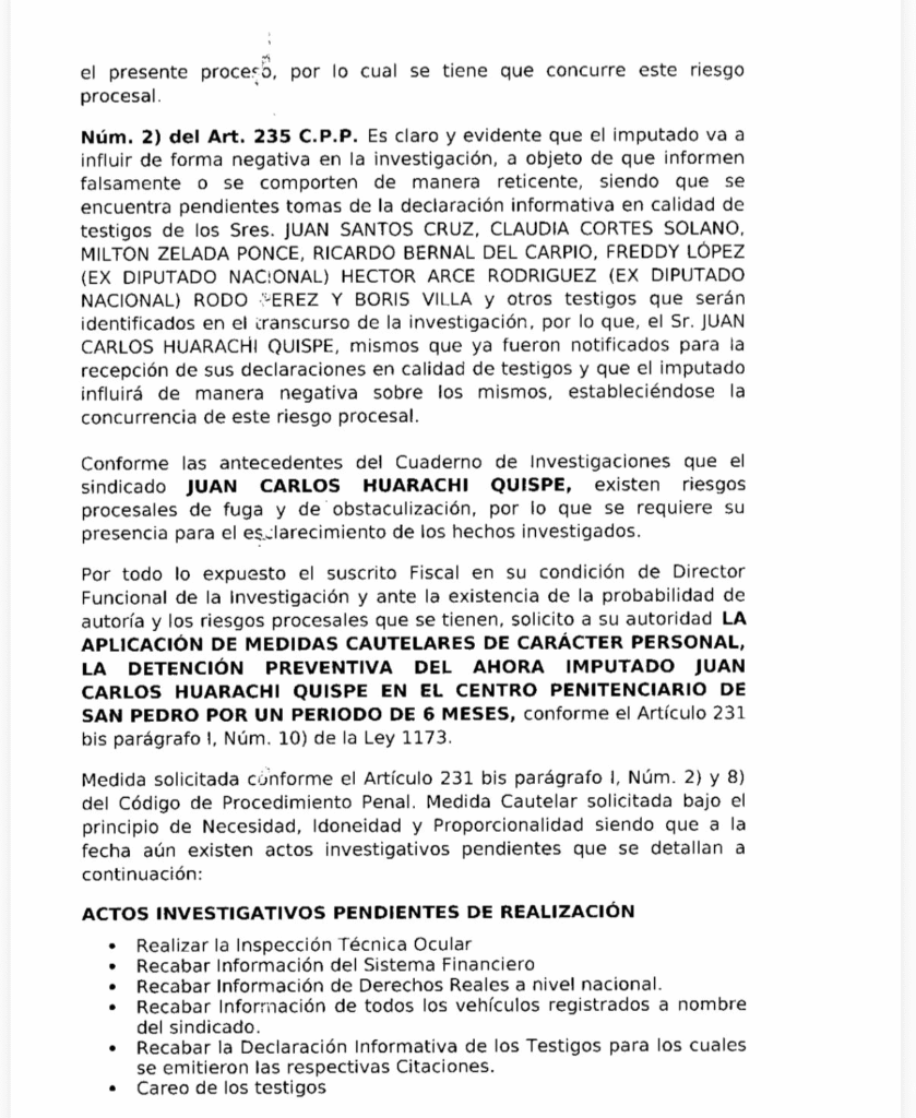 La Paz, 18 nov de 2025 (RED DTV).- La Fiscalía Especializada en Delitos de Anticorrupción, Legitimación de Ganancias Ilícitas y Delitos Tributarios y Aduaneros de La Paz solicitó este martes la detención preventiva de Juan Carlos Huarachi Quispe en el Centro Penitenciario de San Pedro por un período de seis meses, debido a los riesgos procesales de fuga y de obstaculización en el marco de las investigaciones en su contra.