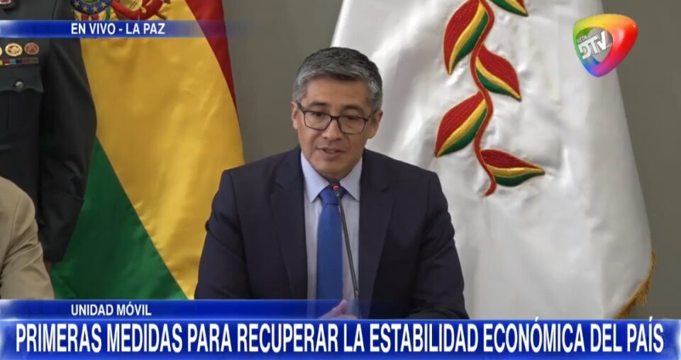 La Paz, 25 nov de 2025 (RED DTV).- El Gobierno anunció este martes un paquete de medidas económicas orientadas a mejorar la eficiencia del gasto público y fomentar la inversión privada. Entre las acciones más destacadas se encuentra la abrogación de cuatro impuestos, que, aunque representan menos del 1% de la recaudación fiscal, han sido señalados por generar contradicciones y desincentivar la actividad económica. Los tributos que serán eliminados son el Impuesto a las Grandes Fortunas, el Impuesto a las Transferencias Financieras, el impuesto al Juego y el aplicado a las Promociones Empresariales.
