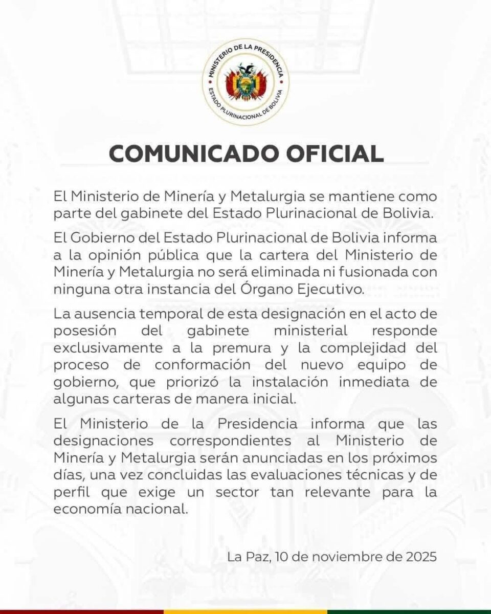 La Paz, 10 de nov de 2025 (RED DTV).– El Gobierno informa que el Ministerio de Minería y Metalurgia se mantiene como parte del gabinete. No será eliminado ni fusionado con otra cartera. Las designaciones correspondientes se anunciarán en los próximos días.