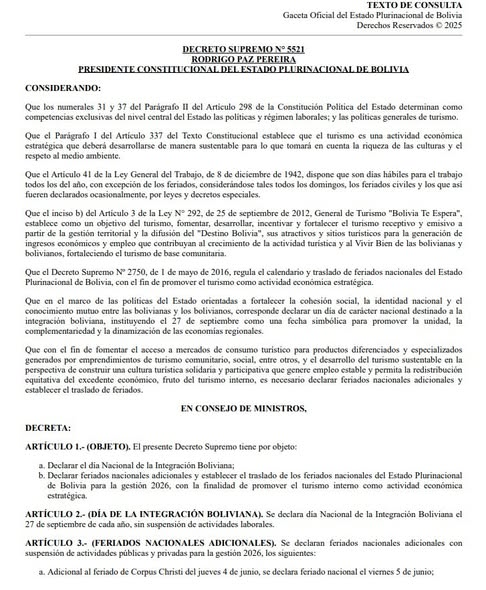 El Ejecutivo fundamentó la medida en la necesidad de incentivar el turismo interno, fortalecer el turismo comunitario y generar empleo, en concordancia con la Ley General del Trabajo, la Ley General de Turismo “Bolivia Te Espera” y el Decreto Supremo N° 2750, que regula el calendario y traslado de feriados nacionales.