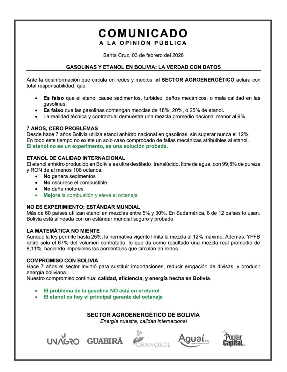 El sector agroenergético destacó que el etanol producido en Bolivia cumple estándares internacionales, con 99,5% de pureza y alto octanaje, y que su uso es común en más de 60 países. Finalmente, ratificó su compromiso con la sustitución de importaciones y la producción de energía nacional, insistiendo en que el etanol es un garante del octanaje y no el causante de los problemas denunciados en la gasolina.