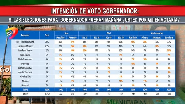 El desglose por segmentos muestra que Camacho mantiene el liderazgo en hombres y mujeres, así como en casi todos los rangos etarios, con mayor respaldo entre personas mayores de 60 años. Medrano, en tanto, concentra su apoyo en mujeres y jóvenes, mientras que Velasco destaca entre el electorado joven y con formación superior. La encuesta fue realizada sobre una muestra de 1.258 casos, reflejando un escenario electoral con un favorito claro, pero con disputa abierta por el segundo lugar.