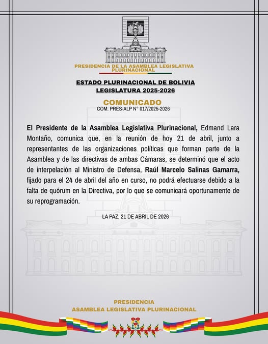 Según el COM. PRES-ALP N 017/2025-2026, el presidente de la Asamblea Legislativa Plurinacional, Edmand Lara Montaño, comunicó que en la reunión realizada este 21 de abril, junto a representantes de organizaciones políticas y directivas de ambas cámaras, se determinó la suspensión del acto debido a la falta de quórum en la Directiva.