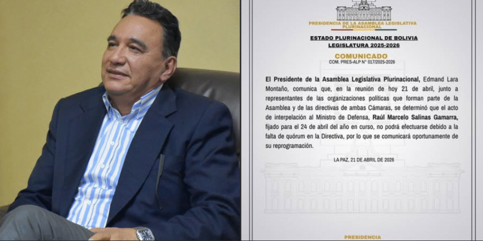 LPZ, 21 abr 2026 (RED DTV).- La Vicepresidencia del Estado Plurinacional de Bolivia informó, mediante un comunicado oficial, que la interpelación al ministro de Defensa, Raúl Marcelo Salinas Gamarra, prevista para el 24 de abril, no podrá llevarse a cabo en la fecha establecida.