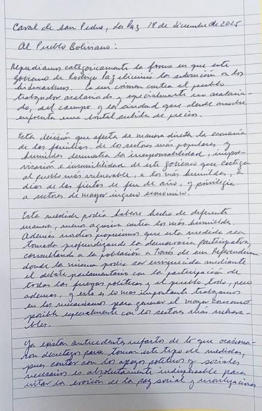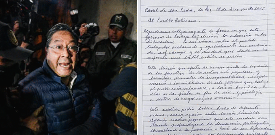 Bolivia, 18 dic 2025 (RED DTV).- Desde la cárcel de San Pedro, el expresidente Luis Alberto Arce Catacora envió este jueves una carta dirigida al pueblo boliviano en la que rechaza la eliminación de la subvención a los hidrocarburos dispuesta por el gobierno de Rodrigo Paz, advierte una “brutal subida de precios” tras la medida y denuncia que su detención preventiva responde a una decisión de carácter político para desviar la atención de los efectos del Decreto Supremo que elevó los precios de los combustibles.