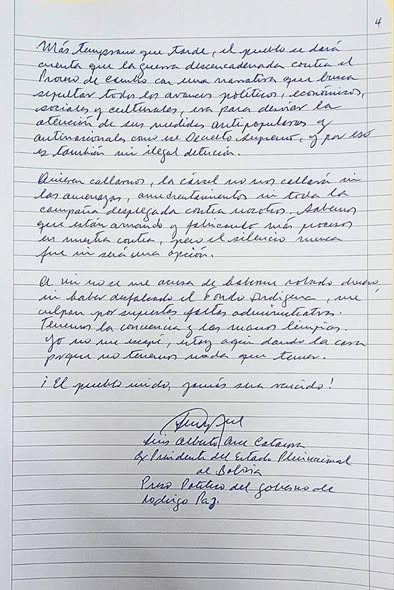 Más temprano que tarde, el pueblo se dará cuenta que la guerra desencadenada contra el Proceso de Cambio con una narrativa que busca sepultar todos los avances políticos, económicos, sociales y culturales, era para desviar la atención de sus medidas antipopulares y antinacionales como ese Decreto Supremo, y por eso es también mi ilegal detención.