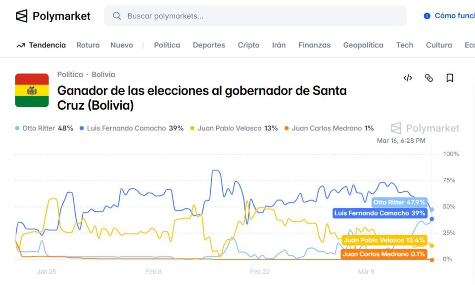 El comportamiento del mercado se produce en medio de la disputa política entre Camacho y JP. Sin embargo, aunque Ritter aparece como favorito en la plataforma, las proyecciones de mercados de predicción no constituyen ni garantizan el resultado final en las urnas.