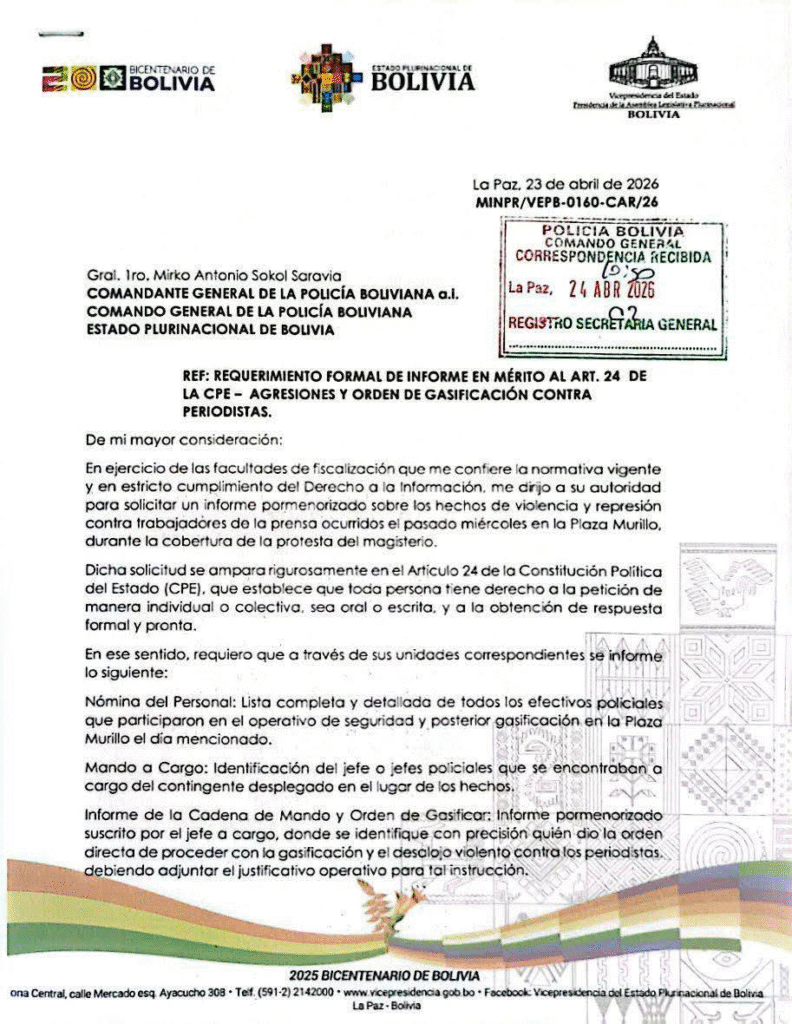 Bolivia, 24 abr 2026 (RED DTV).- La Vicepresidencia del Estado envió un requerimiento formal al Comando General de la Policía Boliviana para que informe sobre los hechos de violencia y la orden de gasificación contra periodistas registrados durante una protesta en la Plaza Murillo.