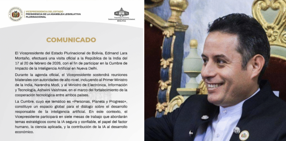 Bolivia, 15 feb 2026 (RED DTV).- Con un comunicado la Vicepresidencia del Estado Plurinacional de Bolivia confirmó que el vicepresidente Edmand Lara viajará a la República de la India para participar en la Cumbre de Inteligencia Artificial, un evento que se llevará a cabo del 17 al 20 de febrero.
