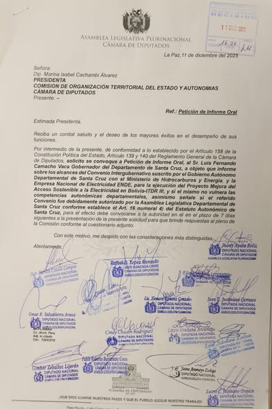 Santa Cruz, 12 dic de 2025 (RED DTV).- La Bancada Departamental de LIBRE solicitó a la Asamblea Legislativa Plurinacional convocar a Petición de Informe Oral al gobernador cruceño Luis Fernando Camacho, para que detalle los alcances del convenio firmado con el Ministerio de Hidrocarburos y Energía y ENDE, mediante el cual —según denuncian— habría delegado competencias exclusivas de la Gobernación en materia de electrificación rural y otros aspectos que deberán ser esclarecidos ante la Comisión de Organización Territorial del Estado y Autonomías.
