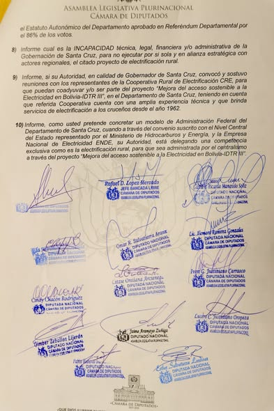 “La Bancada Departamental de LIBRE en la Asamblea Legislativa Plurinacional, solicita formalmente se convoque a Petición de Informe Oral al Gobernador de Santa Cruz Luis Fernando Camacho, para que explique los alcances del Convenio suscrito con el Ministerio de Hidrocarburos y Energía y la Empresa ENDE, en la cual delega competencias autonómicas exclusivas de la Gobernación en cuanto a electrificación rural y otros puntos relacionados qué deberán ser explicados al pleno de la Comisión de Organización Territorial del Estado y Autonomías de la Cámara de Diputados”, publicó en sus redes sociales LIBRE.