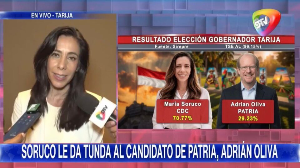 Tarija, 19 abr 2026 (RED DTV).- La candidata de la alianza CDC, María René Soruco, se consolidó como gobernadora electa del departamento de Tarija con resultados preliminares que le otorgan más del 70% de apoyo, imponiéndose con amplia ventaja al candidato de Patria, Adrián Ovila. En contacto con la prensa, celebró el respaldo ciudadano y aseguró que su victoria responde a “un trabajo y un proyecto serio” que marcó la diferencia en la contienda.