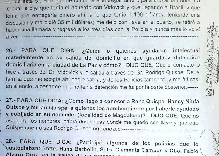 En su declaración ante la Fiscalía, Belaunde identificó a Vidovic como su contacto principal para organizar su escape de detención domiciliaria en La Paz. Según el testimonio, Belaunde llevaba consigo 1.100 dólares, pero Vidovic le habría solicitado 35.000 dólares adicionales para facilitar la operación. Tras esta negociación, Belaunde permaneció encerrado en una habitación durante tres días, hasta que la fuga fue ejecutada con la intervención de la Policía.