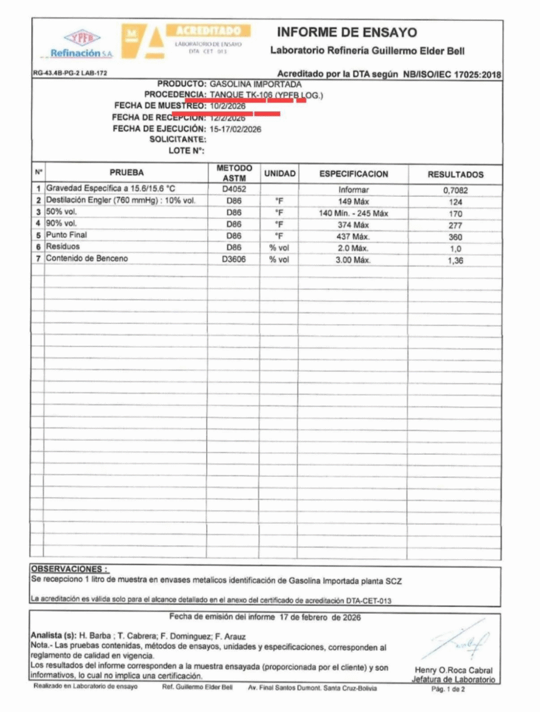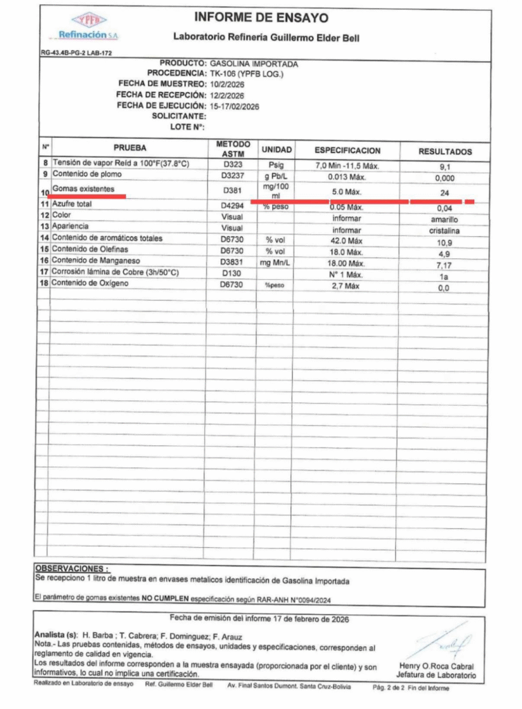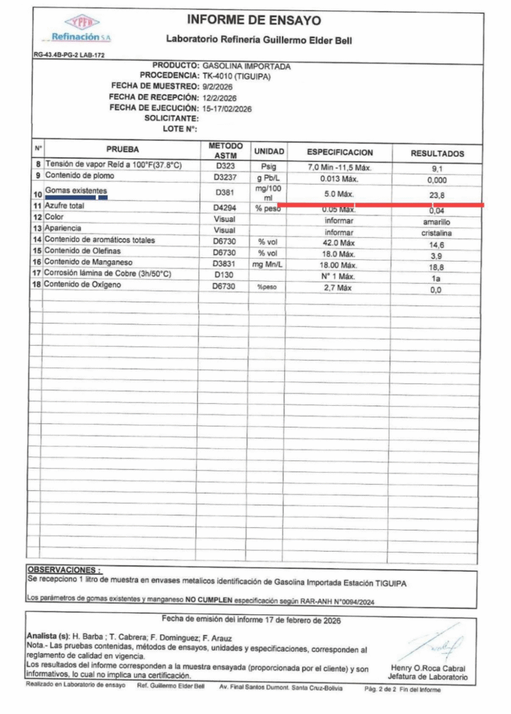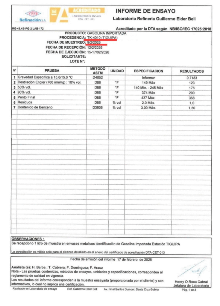 Bolivia, 27 feb 2027 (RED DTV).- La gestión del presidente de YPFB, Yussef Akly se complica cada día más, según informes a los que accedió la RED DTV del Laboratorio Refinería Guillermo Elder Bell no son un solo documento, sino varios ensayos distintos aplicados a gasolina importada que ya se encontraba en el sistema de Yacimientos Petrolíferos Fiscales Bolivianos. Cada informe corresponde a una muestra diferente, tomada en lugares distintos y en fechas específicas, con resultados que no son iguales entre sí. La diferencia clave está en dónde estaba almacenada la gasolina al momento del muestreo.