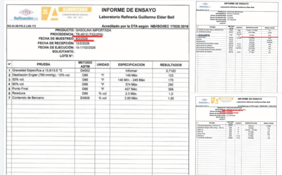 Bolivia, 27 feb 2027 (RED DTV).- La gestión del presidente de YPFB, Yussef Akly se complica cada día más, según informes a los que accedió la RED DTV del Laboratorio Refinería Guillermo Elder Bell no son un solo documento, sino varios ensayos distintos aplicados a gasolina importada que ya se encontraba en el sistema de Yacimientos Petrolíferos Fiscales Bolivianos. Cada informe corresponde a una muestra diferente, tomada en lugares distintos y en fechas específicas, con resultados que no son iguales entre sí. La diferencia clave está en dónde estaba almacenada la gasolina al momento del muestreo.