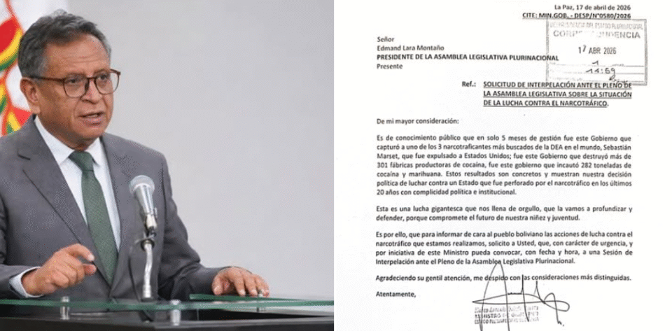 LPZ, 17 abr 2026 (RED DTV).- El ministro de Gobierno, Marco Antonio Oviedo, anunció que envió una carta al presidente de la Asamblea Legislativa Plurinacional, Edmand Lara Montaño, solicitando ser convocado a una interpelación ante el pleno, con el objetivo de informar sobre la lucha contra el narcotráfico.