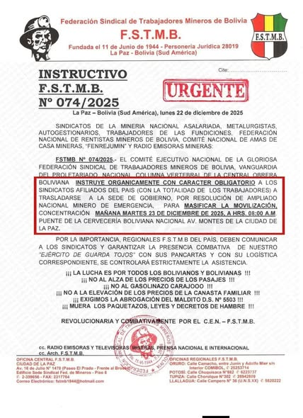 La Paz, 23 dic 2025 (RED DTV).- Mediante un comunicado de la Federación Sindical de Trabajadores Mineros de Bolivia (FSTMB) convoca a la totalidad de sus bases para luchar y llama a una marcha masiva para mañana, martes 23, a las 8:00 am, concentración de la movilización será en la cervecería.