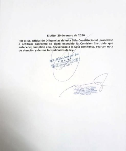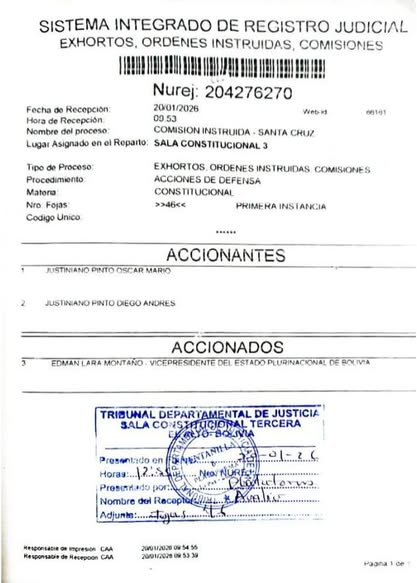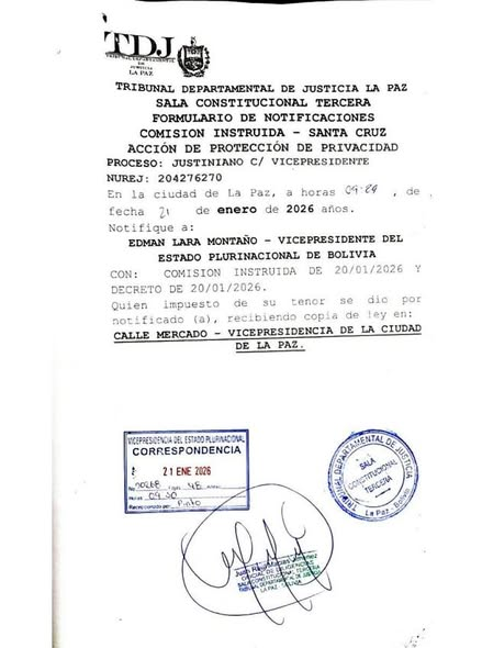 La demanda fue tramitada ante la Sala Constitucional Tercera del Tribunal Departamental de Justicia de La Paz. El vicepresidente Lara ya fue notificado formalmente el 21 de enero de 2026 en su domicilio institucional, ubicado en la Vicepresidencia del Estado Plurinacional de Bolivia.