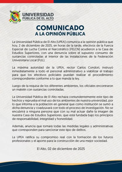 El rector Carlos Condori instruyó que todo el personal administrativo facilite el trabajo policial para realizar el procedimiento conforme manda la ley. Tras el operativo, la universidad emitió un comunicado en el que rechaza “contundentemente” este tipo de hechos y aclara que se sumó a la denuncia presentada ante la FELCN.