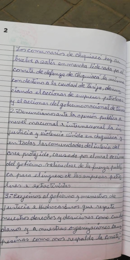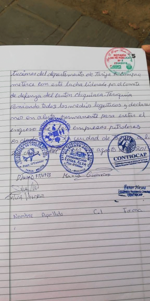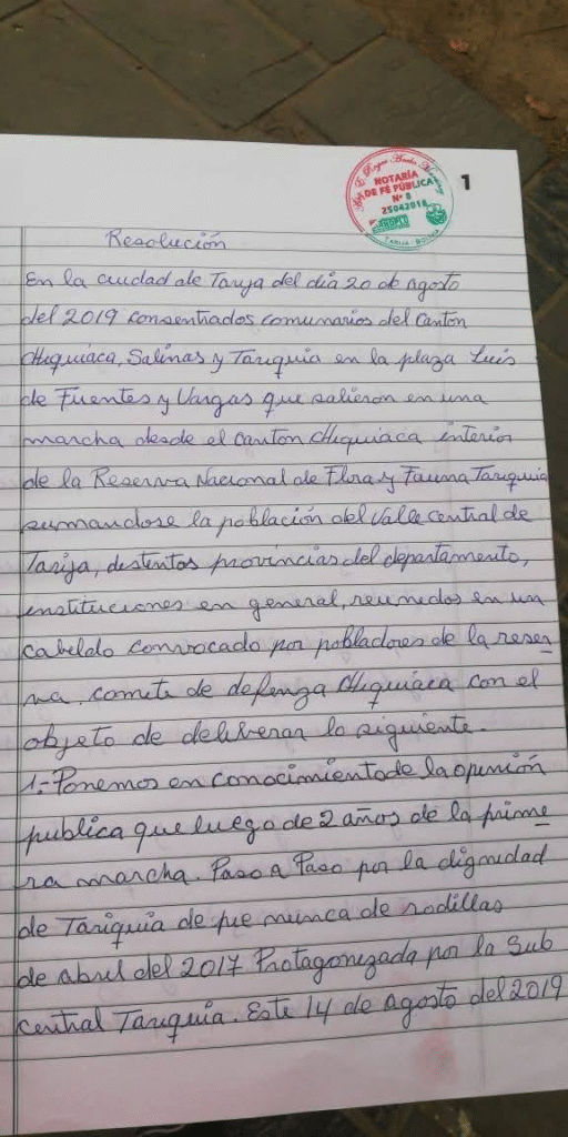 En esa fecha, Paz suscribió una carta y acta notariada en la que se comprometía a proteger la Reserva Natural de Tariquía, a respetar la decisión de las comunidades y a impedir el ingreso de empresas petroleras al interior del área protegida. El documento señalaba además la exigencia de anular contratos petroleros en bloques ubicados dentro de la reserva, garantizar el respeto al plan de manejo y zonificación del área, y responsabilizar al Gobierno por cualquier hecho de violencia derivado de acciones extractivistas.