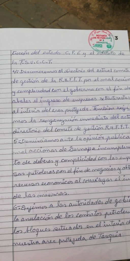 A pesar de ese compromiso firmado, los comunarios denuncian que hoy se observa presencia policial y movimiento de vehículos vinculados a la petrolera Petrobras, presuntamente para ingresar nuevamente a la reserva “a la fuerza”, lo que consideran una clara contradicción con la carta firmada por Paz.
