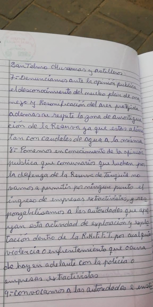 El pronunciamiento de las comunidades recuerda que, según la carta de 2019, “no se permitirá bajo ningún punto de vista el ingreso de empresas extractivistas” y que se responsabiliza a las autoridades de cualquier acto de violencia que pueda ocurrir en el marco de estas actividades.